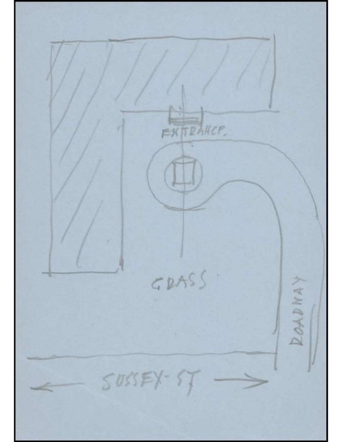 ![Croquis d’un plan. On peut y lire certaines inscriptions en anglais : « Sussex St » [rue Sussex] en bas, « Roadway » [chemin d’accès] à droite, « Grass » [gazon] au centre, et « Entrance » [entrée] en haut. Un carré marque l’emplacement désiré d’une statue à l’extrémité d’un chemin d’accès menant à l’entrée d’un édifice.](https://ledecoublogue.com/wp-content/uploads/2020/10/pic2.jpg)
