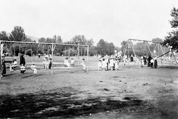 Photographie en noir et blanc d’un parc et d’un terrain de jeu avec deux structures de balançoires et une balançoire à bascule. Des garçons et des fillettes s’y amusent sous la supervision d’adultes.