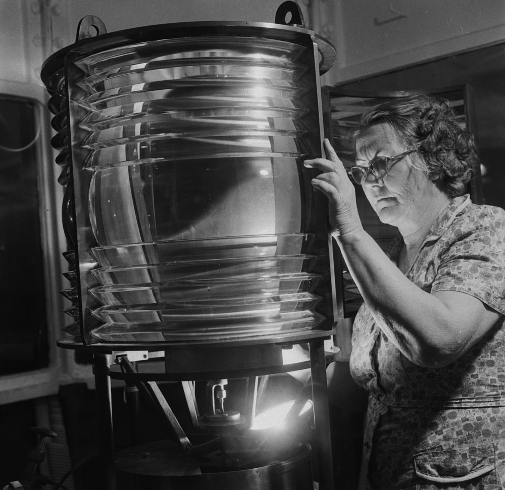 Photographie en noir et blanc d’Eliza Campbell examinant la lampe d’un phare.
