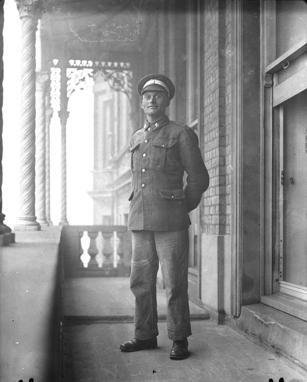 Photographie en noir et blanc d’un jeune homme en uniforme, debout sur un balcon à l’extérieur, les mains derrière le dos.