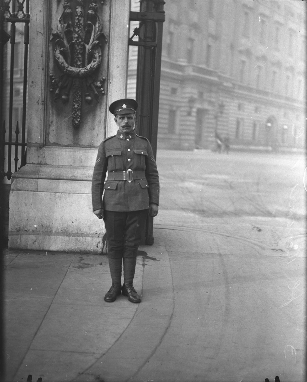 Photographie en noir et blanc d’un soldat portant un couvre-chef à visière orné d’une feuille d’érable. Il se tient au garde-à-vous devant une grande barrière menant au terrain du palais.