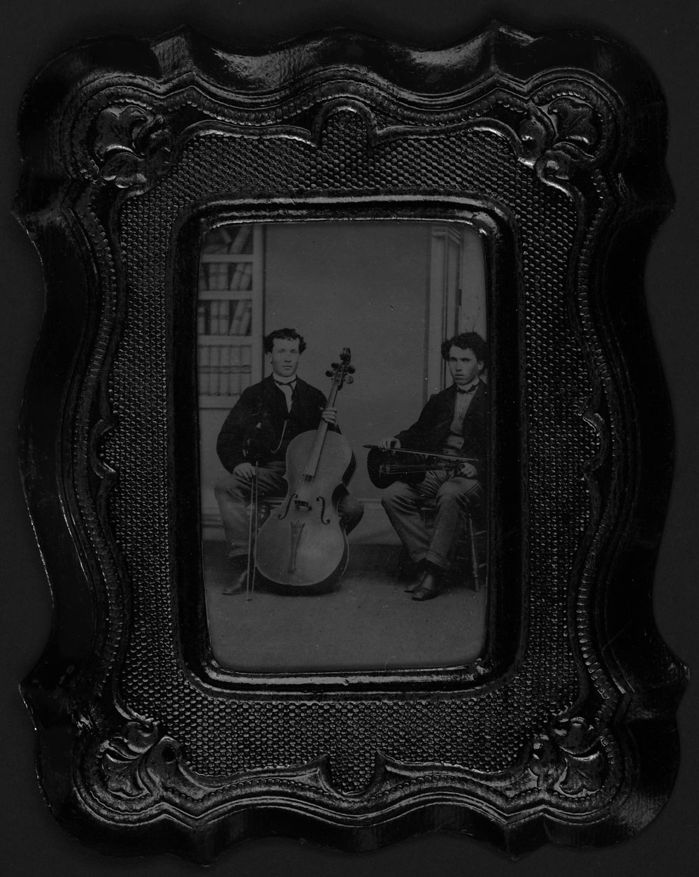 Deux jeunes hommes assis, l’un tenant dans ses mains un violon et l’autre, un violoncelle, milieu du XIXe siècle (MIKAN 3262290)