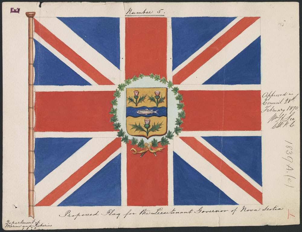 Les armoiries sur le drapeau utilisé en 1870 par le lieutenant-gouverneur de la Nouvelle-Écosse diffèrent des armoiries actuelles de la province et rappellent un malentendu. Les armoiries que nous connaissons aujourd’hui résultent de la tentative infructueuse, menée par sir William Alexander dans les années 1620, de fonder une colonie écossaise en Amérique du Nord. En 1868, les hérauts anglais, qui ne connaissaient possiblement pas l’existence des armoiries d’inspiration écossaise, en ont dessiné de toutes nouvelles, où figuraient trois chardons écossais ainsi qu’un saumon symbolisant les pêcheries de la province. Ce sont donc ces nouvelles armoiries qui se sont retrouvées sur le drapeau du lieutenant-gouverneur. En 1929, à la demande des gouvernements provincial et fédéral, le Collège des hérauts a restauré les armoiries originales de la Nouvelle-Écosse.