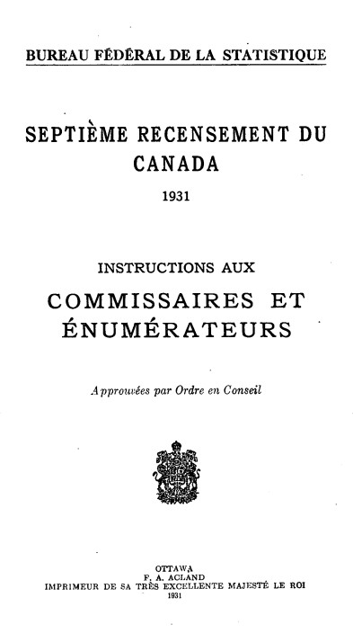 Comme l’indique la page titre, il s’agit des instructions données par le Bureau fédéral de la statistique (l’ancêtre de Statistique Canada) aux commissaires et énumérateurs pour réaliser le septième recensement du Canada, en 1931.