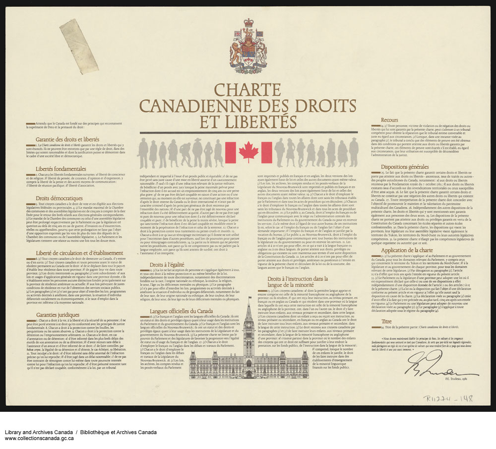 En 1985, après l’entrée en vigueur de toutes les dispositions de la partie I de la Loi constitutionnelle de 1982, le gouvernement souhaite en promouvoir le contenu (c.-à-d. la Charte canadienne des droits et libertés). Pour ce faire, il crée des affiches prenant l’allure d’un document officiel [en y apposant une signature estampillée du premier ministre de l’époque] et en distribue plus de 250 000 dans les écoles, bibliothèques et lieux publics du Canada. L’affiche de la Charte peut aujourd’hui être téléchargée (format PDF) ou commandée en version imprimée (certificat ou affiche) sur le site Web de Patrimoine canadien. Malheureusement, il n’existe pas de version originale officielle de cette affiche dans les collections préservées à Bibliothèque et Archives Canada (BAC).