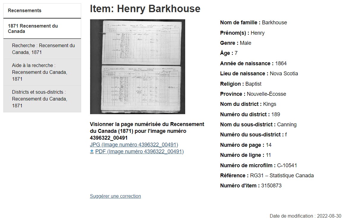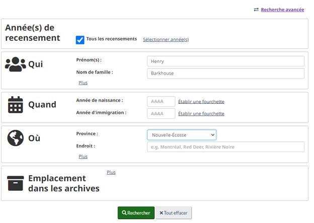 - Recherche dans le recensement, base de données, Bibliothèque et Archives Canada