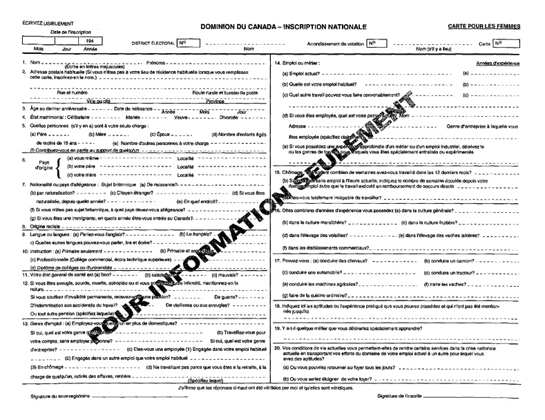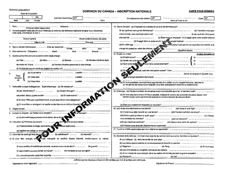 La plupart des sources qui remontent à cette période font encore l’objet de restrictions liées à l’accès à l’information ou à la protection des renseignements personnels en vertu des lois canadiennes. Par conséquent, si vous ne pouvez consulter les données de recensement, vous pouvez vous tourner vers les Registres nationaux de 1940 de Statistique Canada pour obtenir quelques réponses. Source de renseignements très précieuse pour les généalogistes et les historiens, ils sont le résultat de l’enregistrement obligatoire de toutes les personnes âgées de 16 ans et plus, durant la période allant de 1940 à 1946.