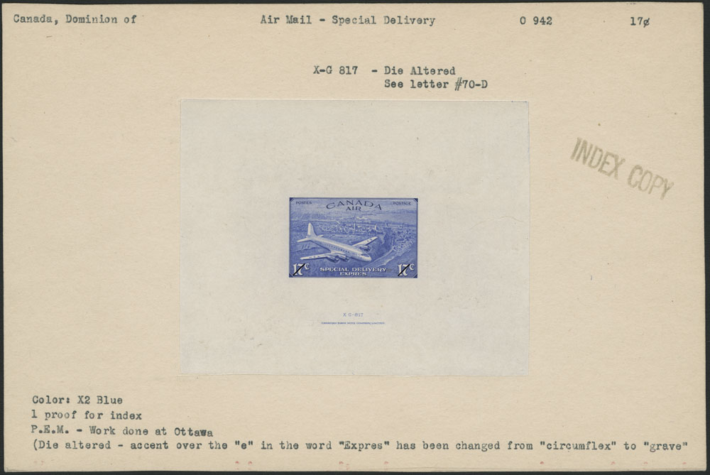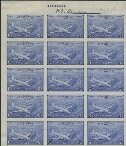 Copie de l’imprimeur montrant l’épreuve finale corrigée du timbre sur le service de poste aérienne exprès. (No MIKAN 6221976)