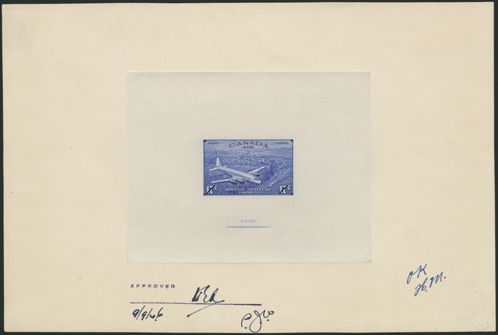 Épreuve finale approuvée du timbre sur le service de poste aérienne exprès. L’orthographe a été corrigée, mais la date est erronée. (No MIKAN 2222203)